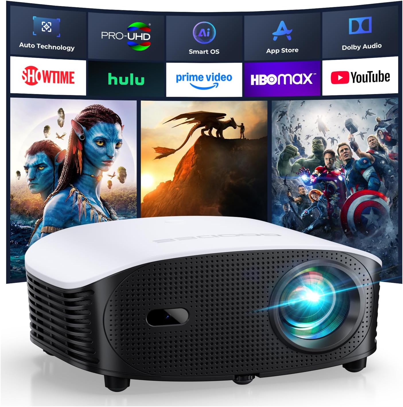 GooDee Smart Mini Projector with WiFi and Bluetooth - 1200 ANSI 4K Support, Compatible with Netflix/YouTube/Prime Video, AI Auto Focus & Keystone, Dolby Audio Home Theater Projector for Indoor/Outdoor