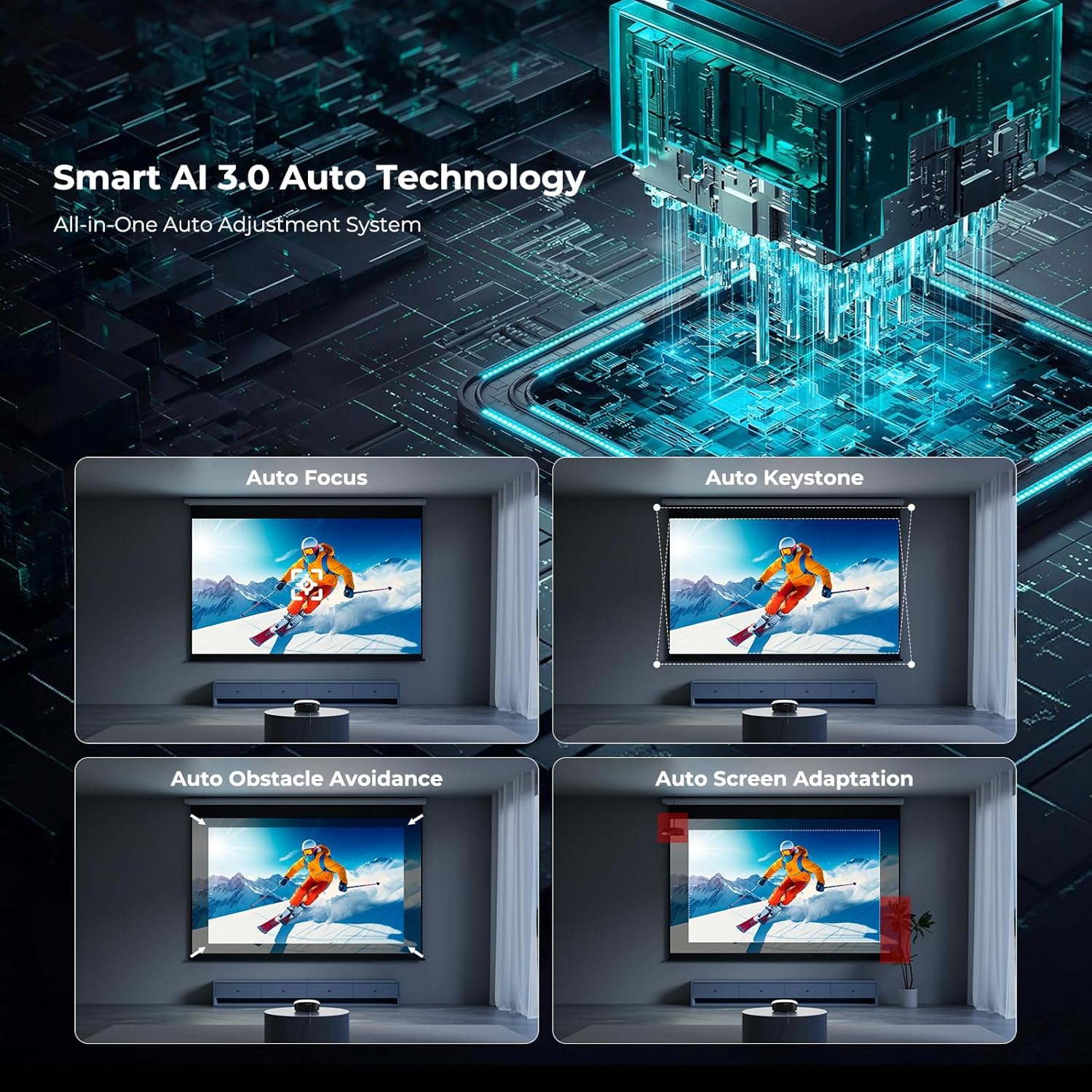 【AI Auto Focus & Smart Screen Fit - Clear Picture in Seconds!】Get a sharp image fast with instant auto focus and auto keystone correction for a well-aligned rectangular picture. Obstacle avoidance helps adjust around nearby objects, and auto screen adaptation fits different wall sizes and surfaces—ideal for movies, gaming, and family nights